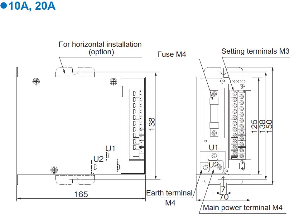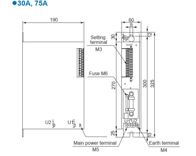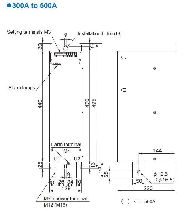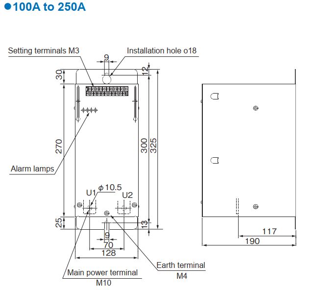 | Kích thước ngoài (External dimensions) | H150×W70×D165mm (cho 10A, 20A) H352×W60×D190mm (cho 30A đến 75A) H325×W128×D190mm (cho 100A đến 250A) H495×W128×D230mm (cho 300A đến 500A) |